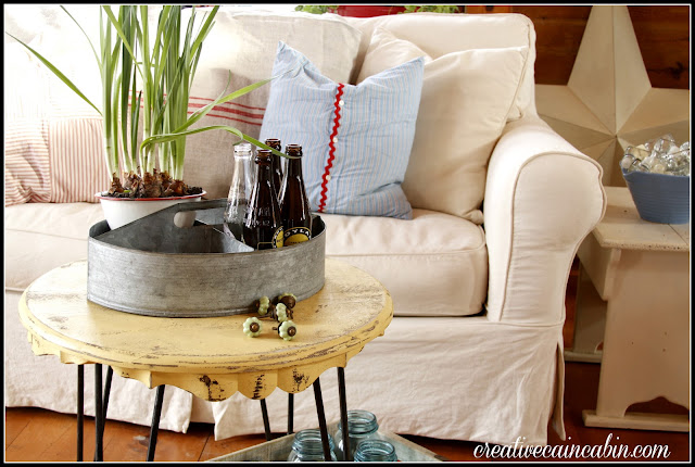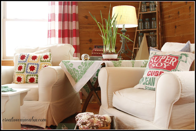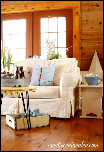 I just love this beautiful bright and cheery room! The white slipcovers looks so good with the wonderful cabin walls! The red and white is a perfect punch of happy color. You have such a great eye for adding all the decorative touches and pillows. I could live in your cabin!