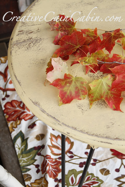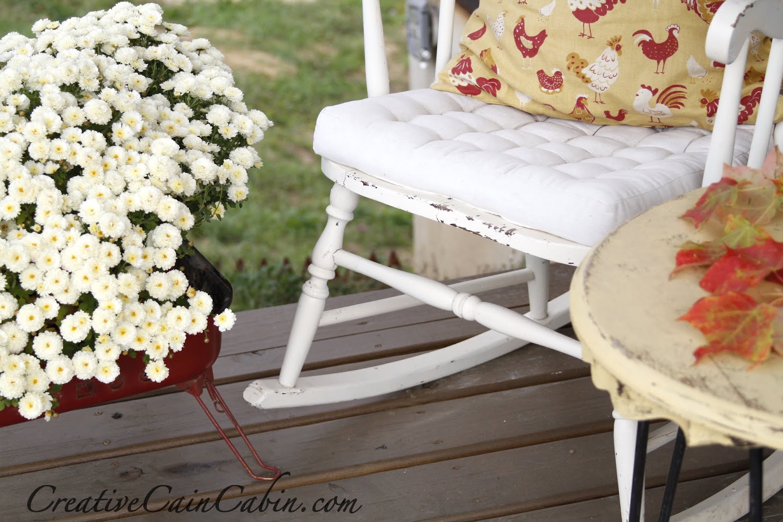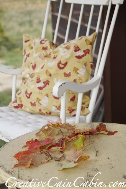First thing that caught my eye,the chicken print pillow..I’m in love!..Dawn love your fall decor on the side porch..your photo’s just “bring it”,Fall has fell on Cabin!