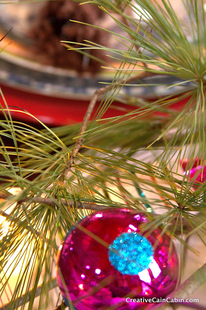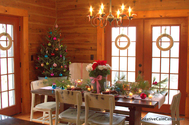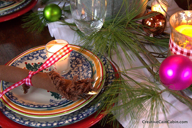 The table runner is a flannel hospital blanket, and the pine branches are from one of our trees.