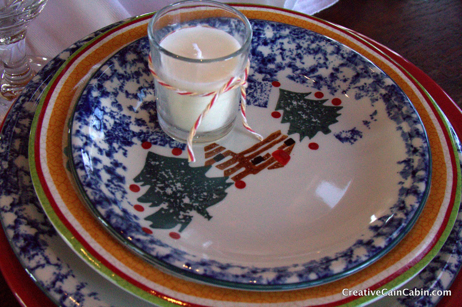 Here’s a closer shot of the dishes, they are a log cabin pattern that I have had for years and use them every Christmas season.