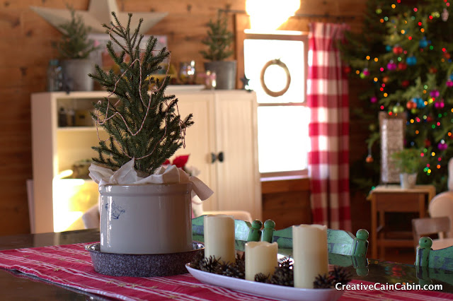 The mini tree was place in a crock that I have had for years, and then it was layered in an old enamel ware pan.