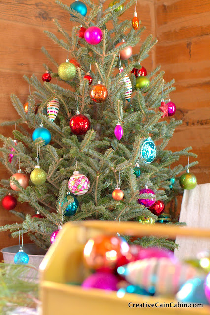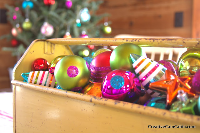 Love all your colorful touches for the season. That yellow tool caddy filled with the colorful ornaments is so cute.