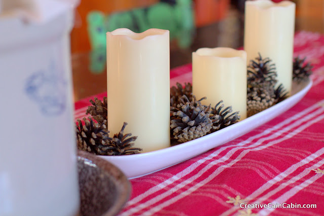 The serving bowl was layered with pine cones and flicker candles that take batteries.