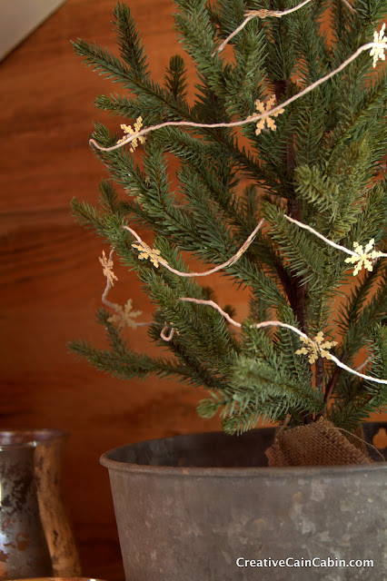 A perfect “mantel” for a cabin. Such a cozy collection of rustic items. The snowflake garland is fun and whimsical.