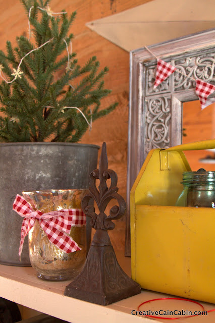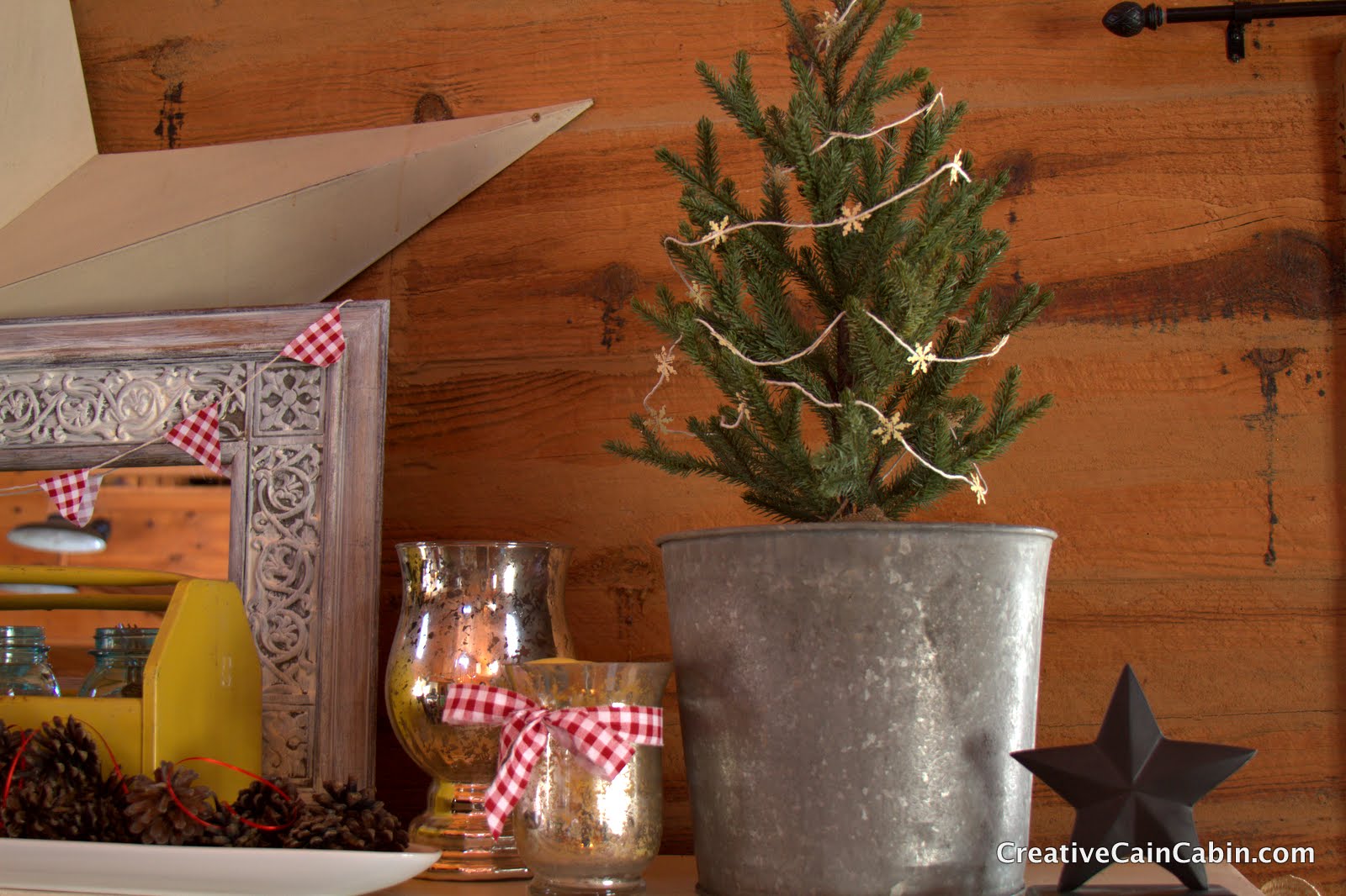 This looks fantastic…I really like the two metal buckets with the trees. The gingham is the perfect touch. Your cabin is looking so festive! Great job on everything. Hope you are having a good week…Ann