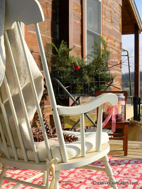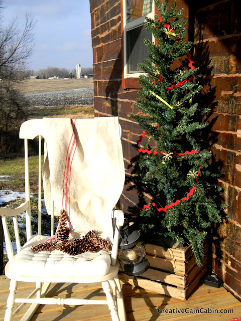 The tree is from Menards and the twin to the one on the front porch, again I dressed it up with some ribbon and a few paper snowflakes. The apple crate is weighted with brick pavers to keep it from blowing over. The rocking chair I purchased about 20 years ago at a garage sale that some college kids were having.