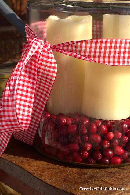 The large glass jar is filled with fresh cranberries and topped with a few candles and then I added a ribbon to dress it all up.