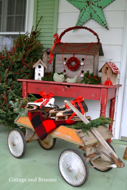 We then moved on to a little porch decorating. I really wanted a baby Christmas tree to put in the vintage wagon but no such luck, no little trees. So plan B, I propped up a tree against the house and the table. I was afraid the tree would get blown over in a stand. It can get really windy up here in northern Michigan in the winter time.