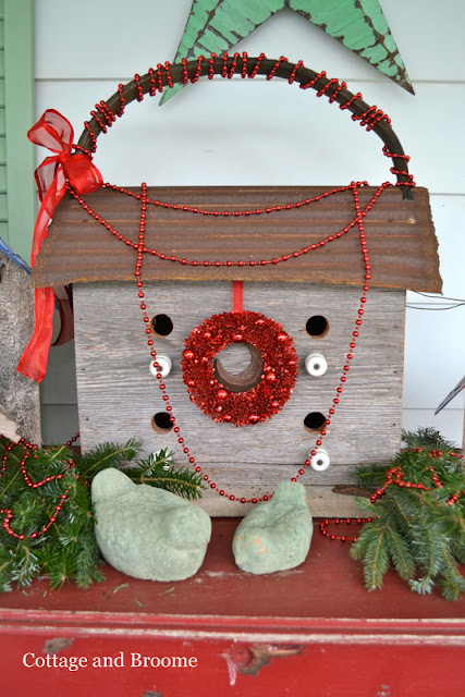 I left the bird houses I used in the fall decorating, added a star, birds, greens and red beaded garland.