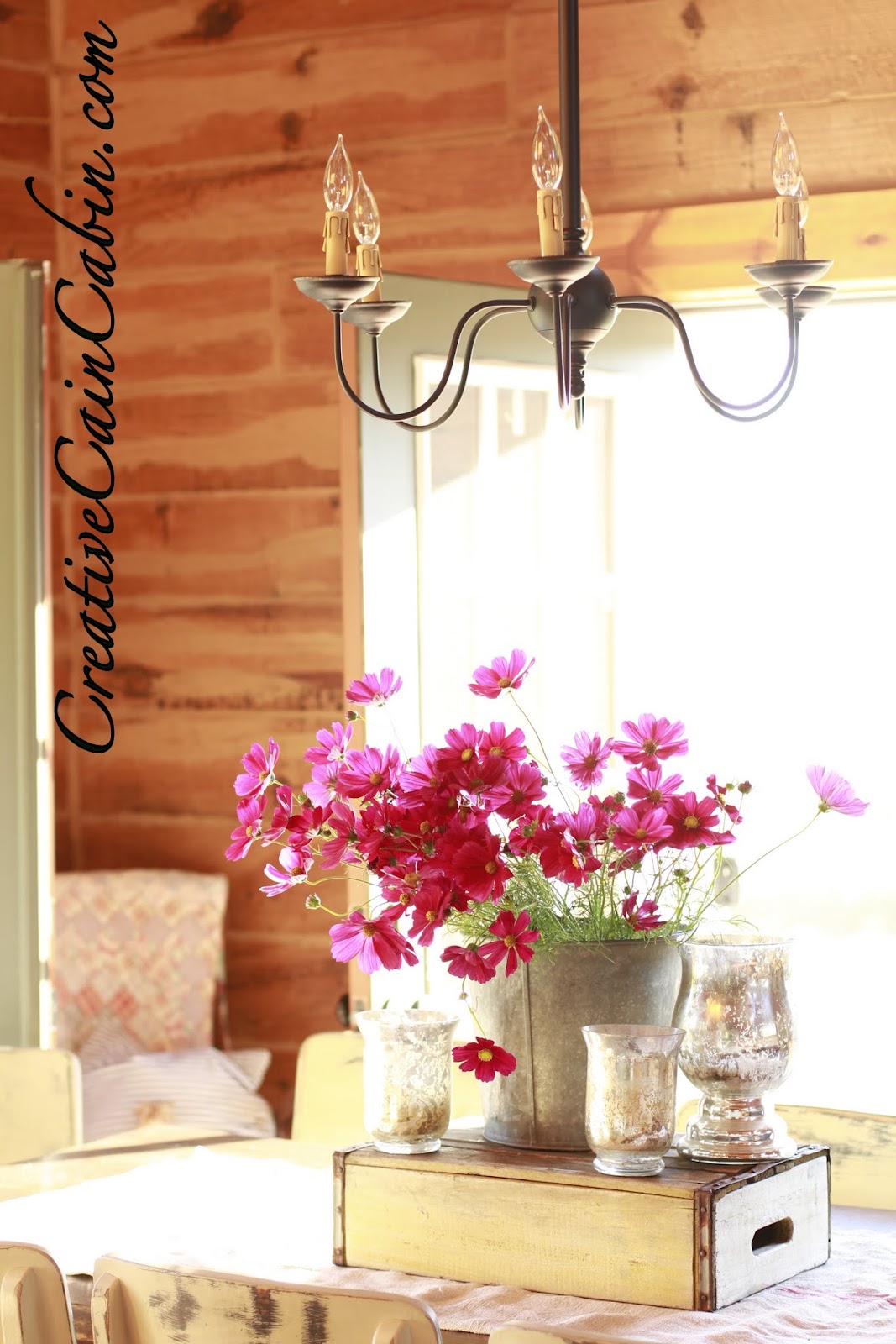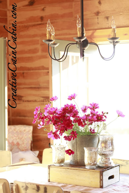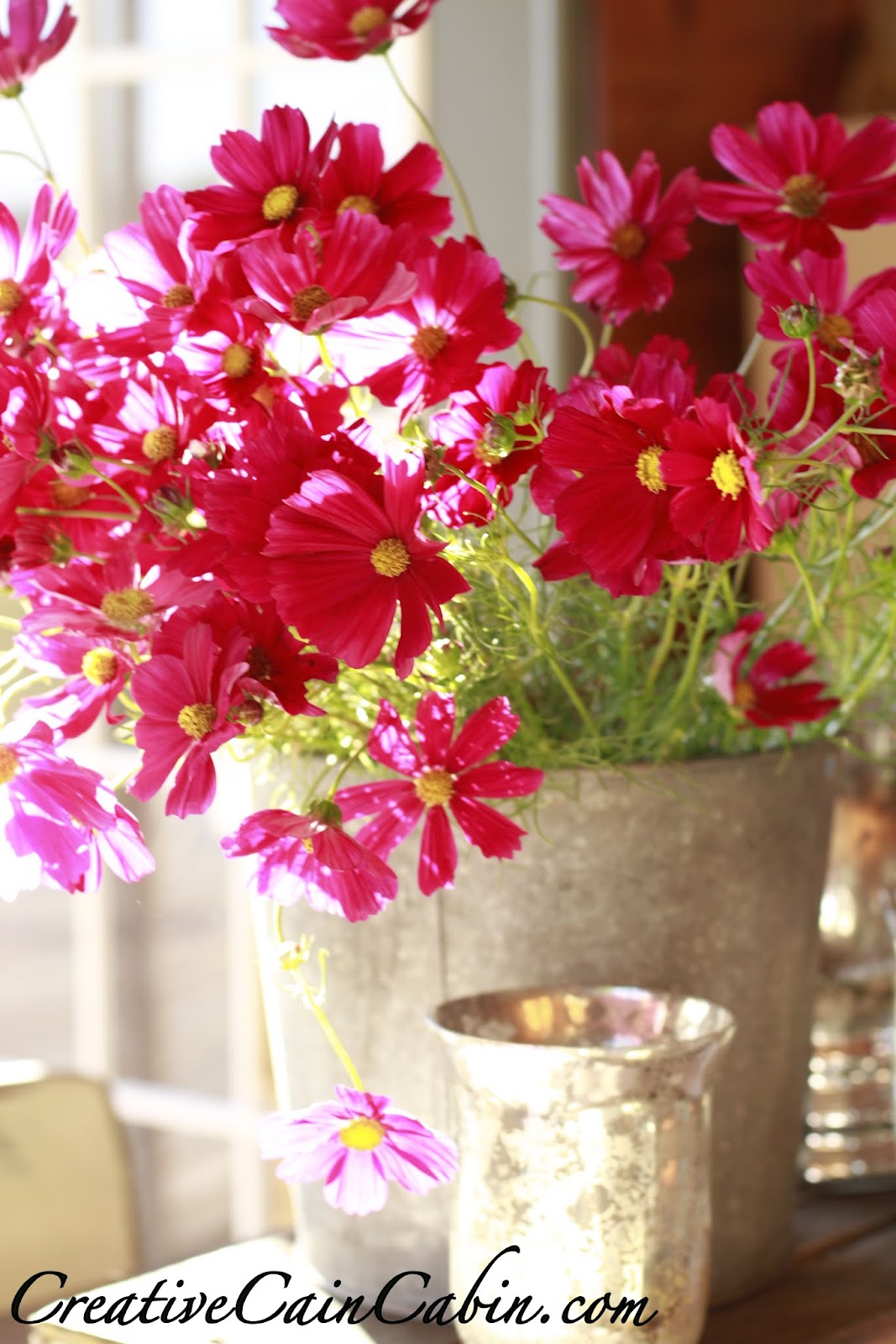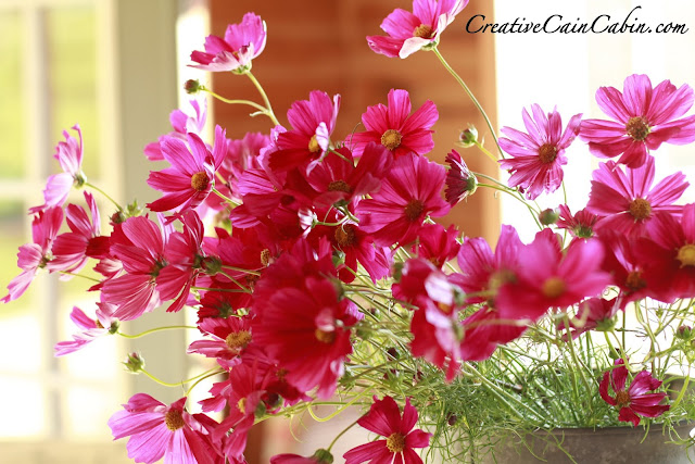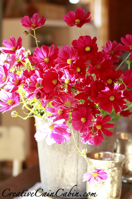 Oh my…your Cosmos is so pretty!! They look great in the tin bucket. What a beautiful table setting!!