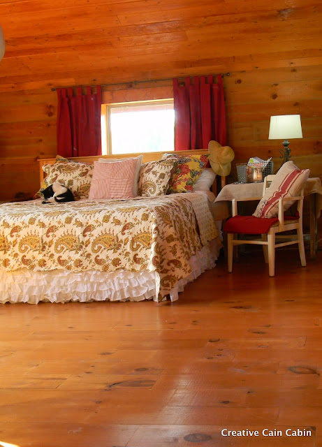 That is a warm and cozy room, love that ruffled bedskirt and the kitty is pretty cute too.