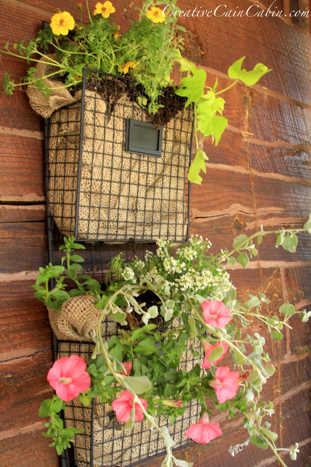 I lined each compartment with burlap, a little dirt, and a few flowers and vines.