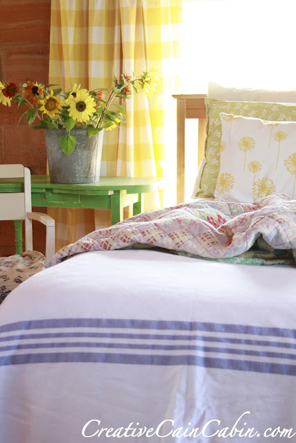 I have had so many people comment on the flannel hospital blanket that I used on the bed in our master bedroom.