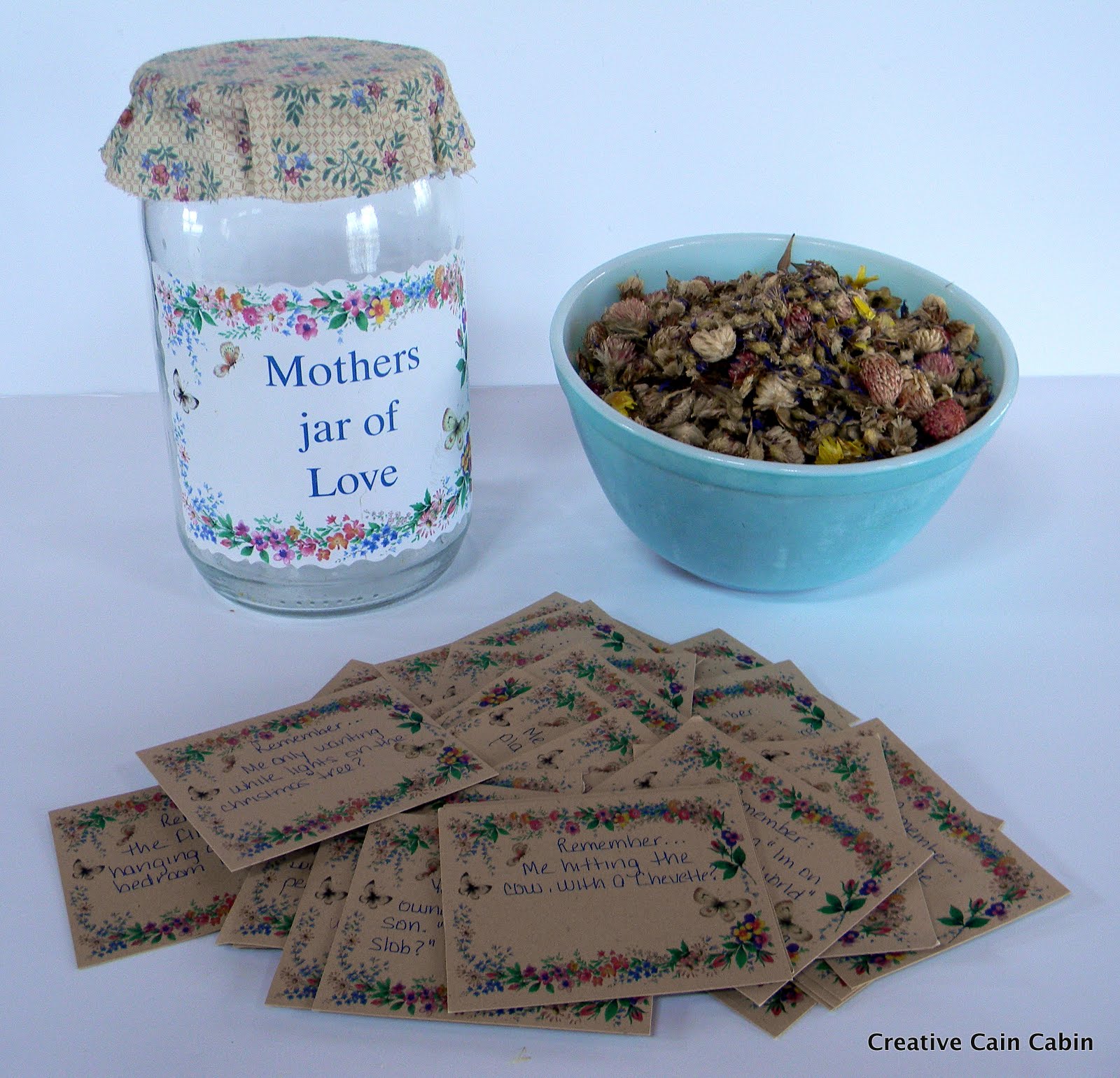 I am so blessed to have such a loving, caring daughter who gave me the perfect Mother’s Day gift.. I was surprised with the most precious, hand made gift from her. Note cards hand written with memories from her childhood were inside a decorated jar enclosed with some pretty smelling potpourri. Each morning as I start my day, I pull out a note card and read it. Some cards leave me laughing as I remember some of the crazy, fun things we have done. Some leave me with a tear rolling down my check. Some are memories of all we have shared together and how things are so much easier to bear because we have each other to love. And then there’s the things I never knew about (Mom’s always the last to know)! I picture the little girl she was, with a cool-aid mustache and marvel at the wonderful woman she has become. My daughter, my friend and a wonderful gift from God.