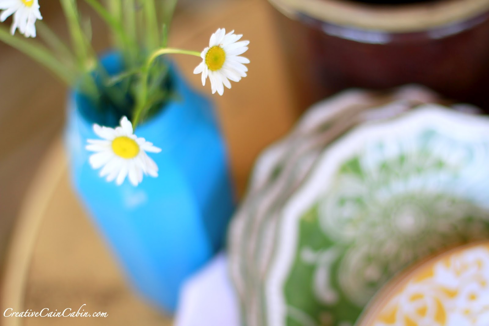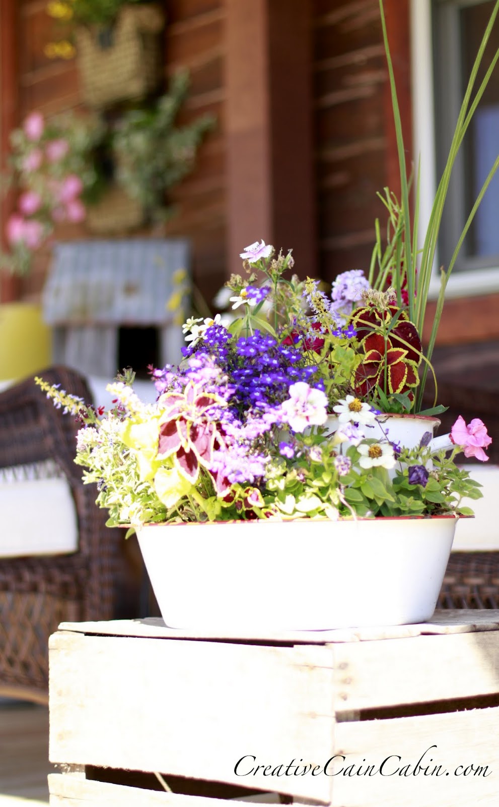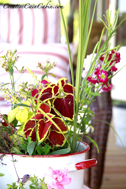 What a beautiful porch. I think I’ll just park it here a while and wait for my cool drink! I love the little tin bowl planted with flowers.