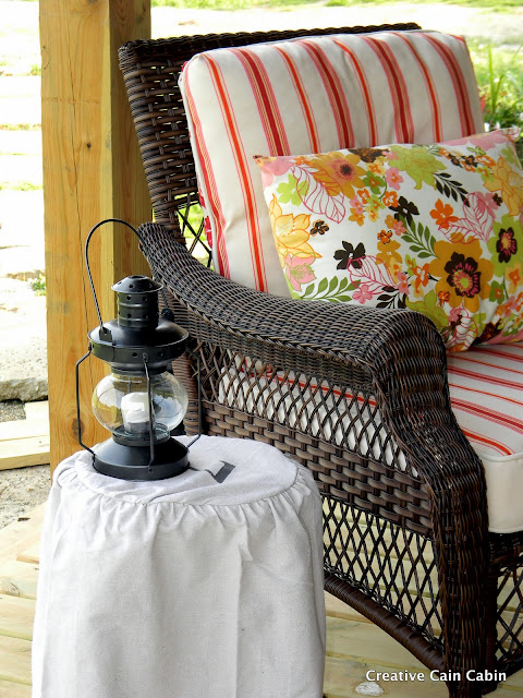 What a warm and welcoming porch decor. Love it. My favorites are the daisy pillow, the lantern and the slipcover for the IKEA table.