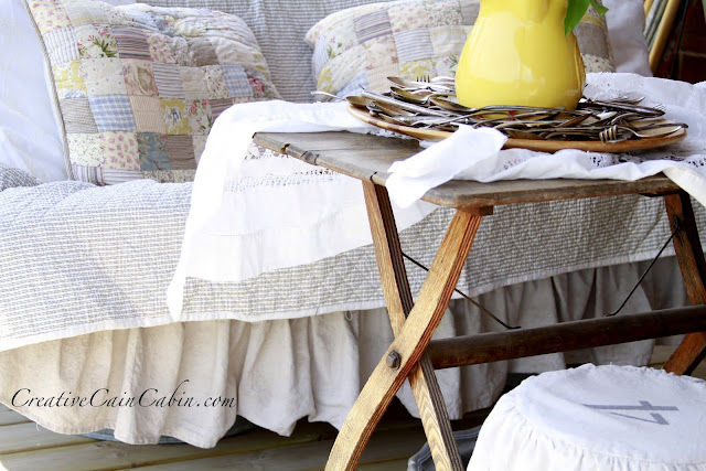 1. Oh how beautiful.cozy, and inviting!! I would love to be sitting there! I love the quilts! You swing,and stools are beautiful.