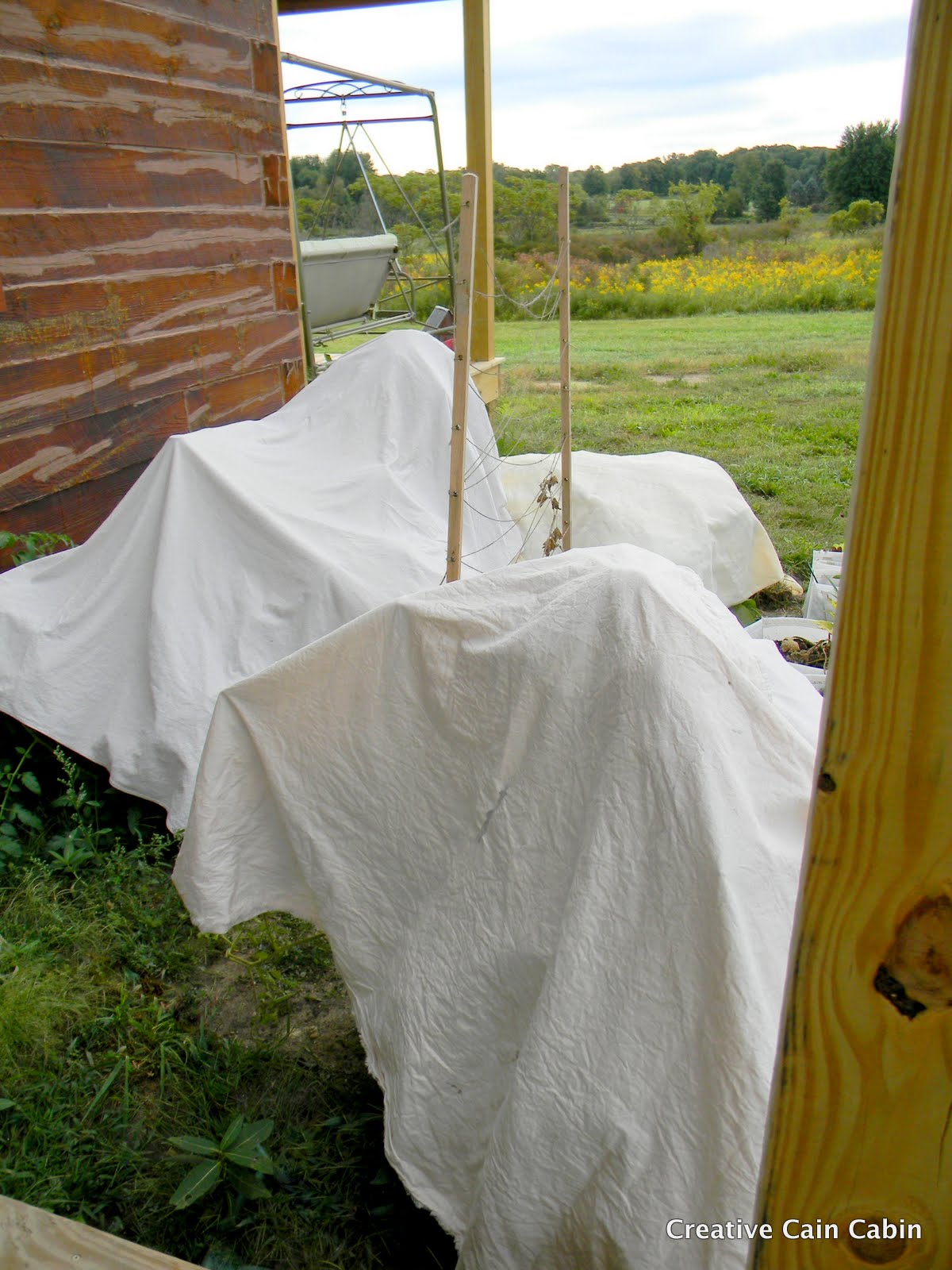 First I thought you were decorating for Halloween. Then I thought it was the chance of frost. Then I went back to the idea of you decorating. Too funny. Your tomato plants look great. I should send you a picture of my one plant. It has 3 tiny tomatoes on it.