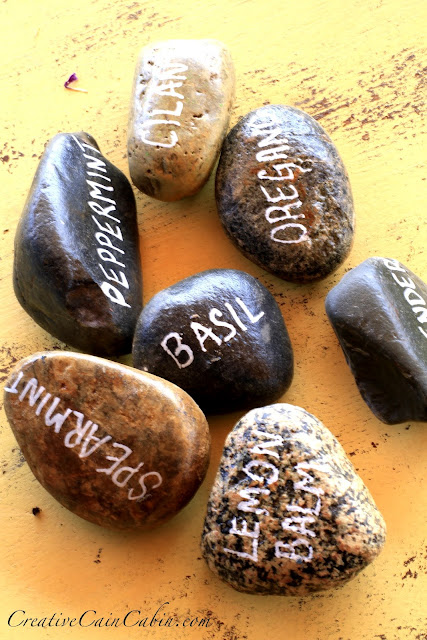 First I gave the rocks a good bath and let the dry in the sun. Then I used a paint pen to write the herb name on each stone, and finished them off with a coat of clear spray paint.