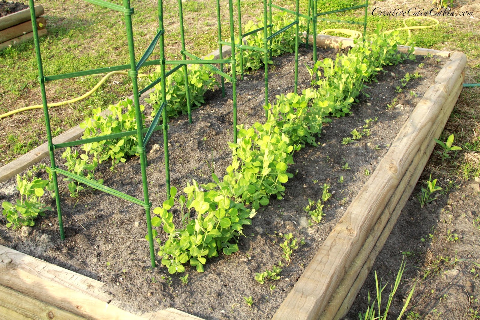 I put the tomato trellises into the ground and planted the peas along side them. I figured the peas could grow up the tomato stakes and be harvested long before the tomatoes would actually need them.