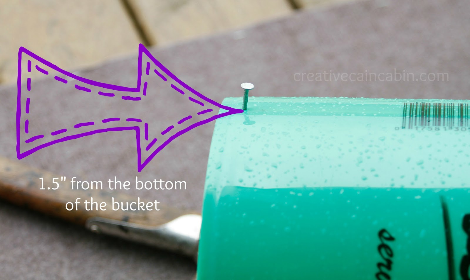 Grab a Hammer and Nail and pound the nail into the bucket 1.5″ from the bottom. Leave the nail sticking out enough so you can pull it out again.