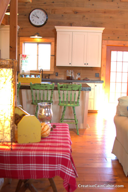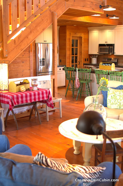 I love everything about your sweet cabin! Have you thought about hanging a quilt up there on the big wall? Easy to change out with the seasons, if you can find them at estate sales, etc. They might be cheaper than the metal sign and easier to find too! Love all the cheery colors you use…well done!