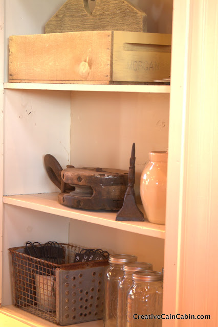 Good morning friend! Oh how I love your home! It is filled with country charm and I spotted so many things I love. I did see pupper looking out the window in first shot. I love the slipcovered furniture! Good shoppah! I love the antique pully on a shelf. The tin star on the cupboard. The buffalo check curtains! The overall comfy feel of the whole space! Just love it. I have very tall vaulted ceiling in my family room, and on the tall wall above the sofa, I hung a favorite quilt that I made. It is the right color and takes over a huge space. I have never tired of it. You may look for something like that, and it would fit with your cabin home! Now I am going to go see more of your kitchen!