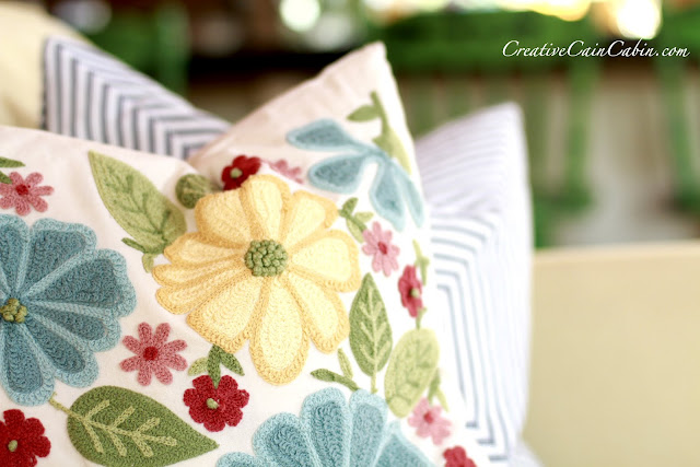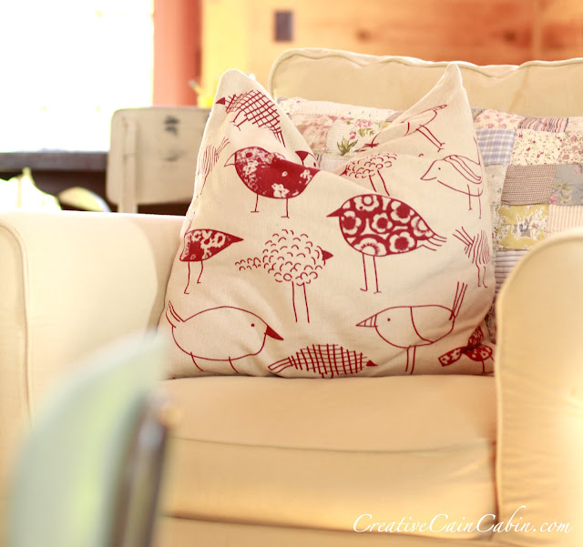 The bird pillow came from TJMaxx and the patchwork one behind it was thrifted.