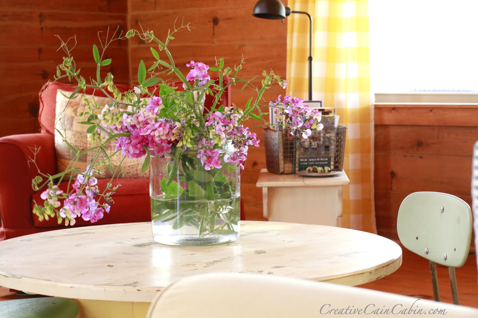 How cheerful! I really like the yellow touches. I am a sucker for checked material in anything; so the curtains really caught my eye. 🙂 someday I will have slip covered sofas! 🙂