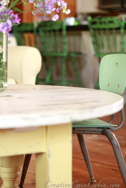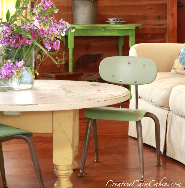 The green children’s school chairs were thrifted and often used as foot stools.