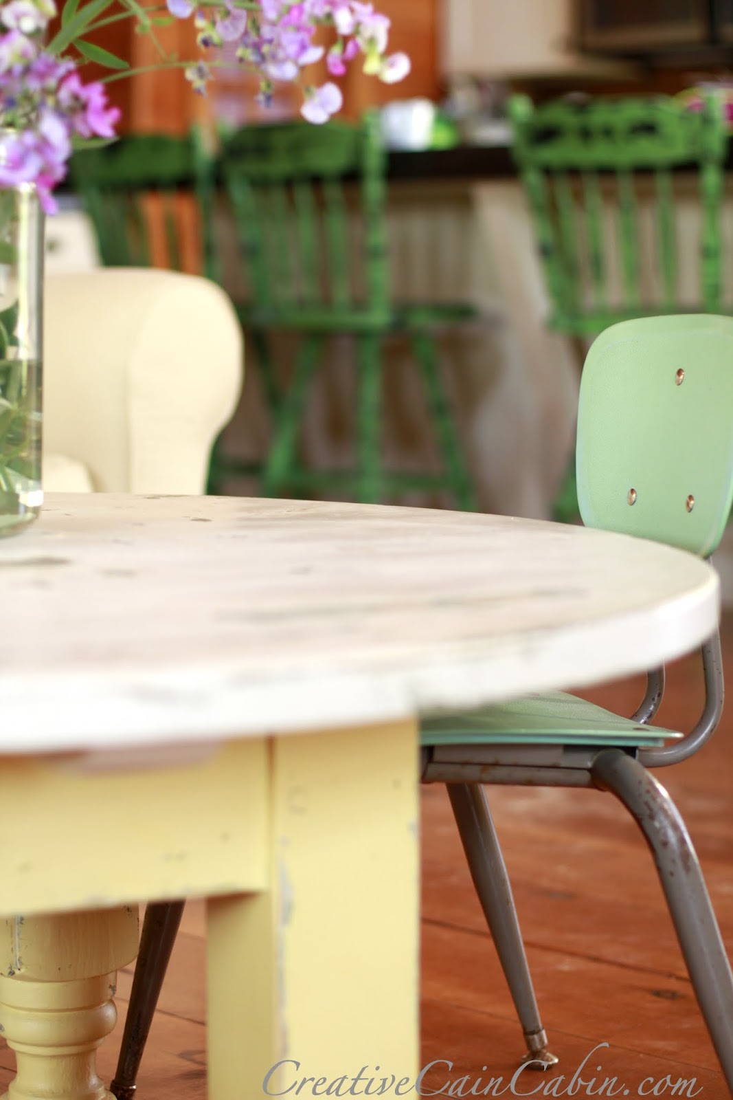 The base is Martha Stewarts “Cornbread Yellow” and the top is ASCP in “Country Grey” heavily distressed.