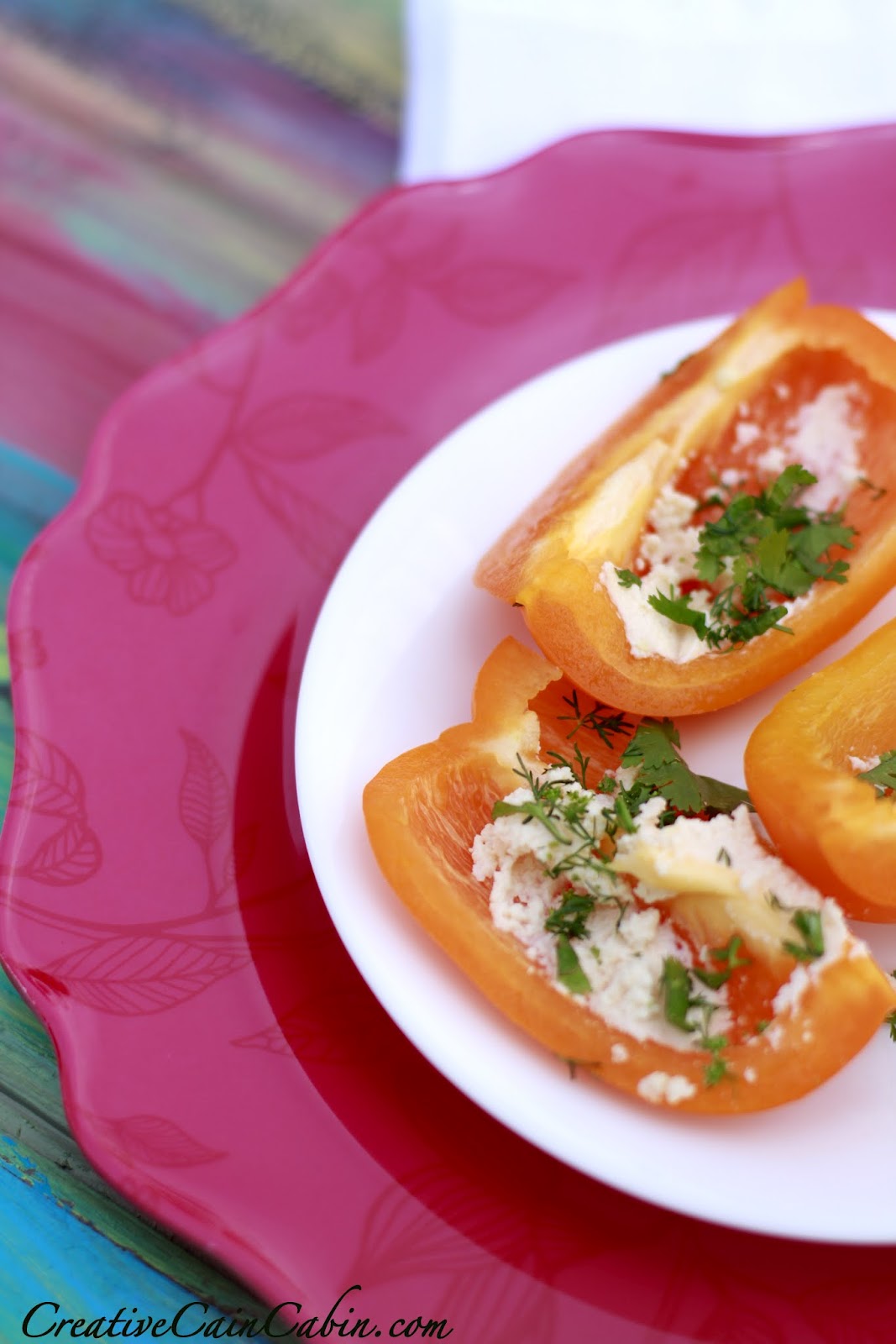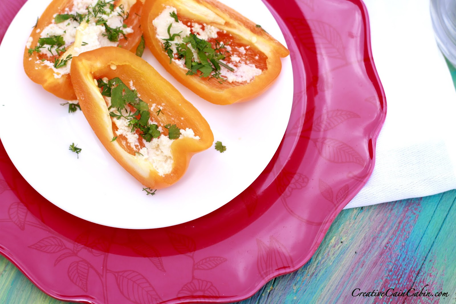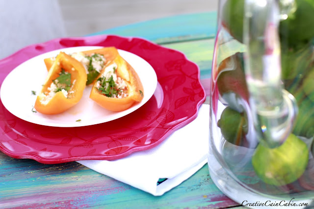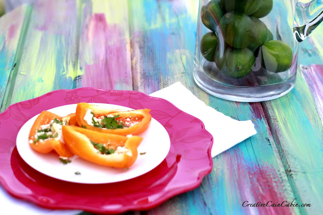 My little snack is an orange pepper topped with queso fresco chipolte cheese and fresh cilantro from my garden.