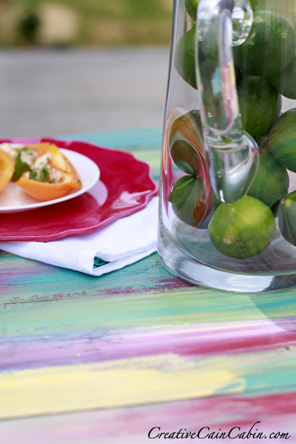 I gathered all the paint samples I had on hand and painted the table with a water color effect.