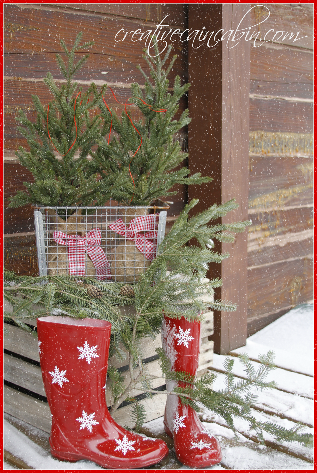 The boots are adorable!! I also love the trees stuck in the pool basket, with that skinny red ribbon. Too cute!