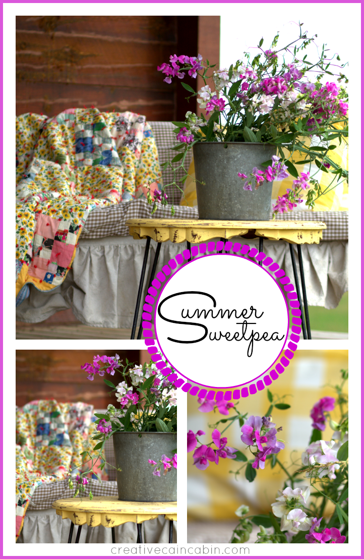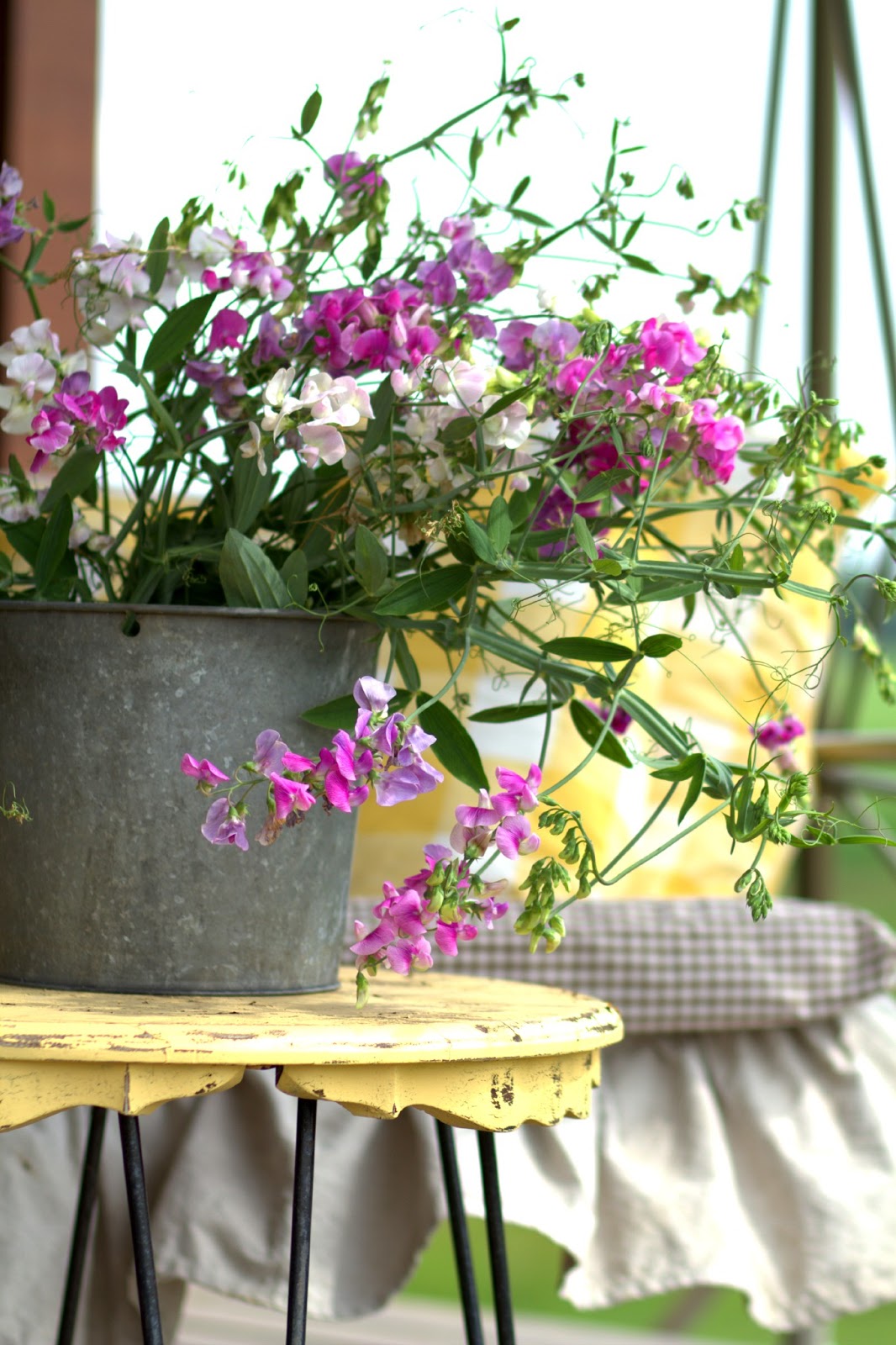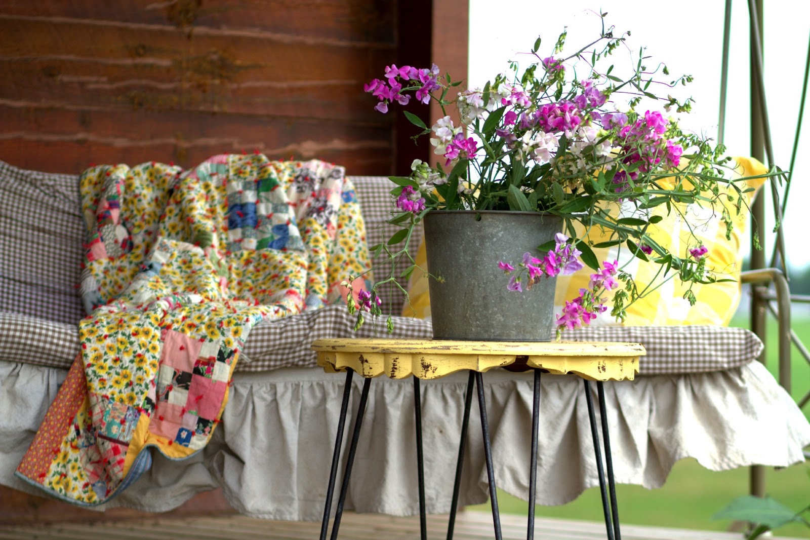 Your sweet peas are so pretty! Twice I’ve planted a perennial sweet pea vine and it hasn’t come back. Next year I’m starting from seed to get those sweet blossoms. I love all the yellows on your porch and the vintage quilt is divine!