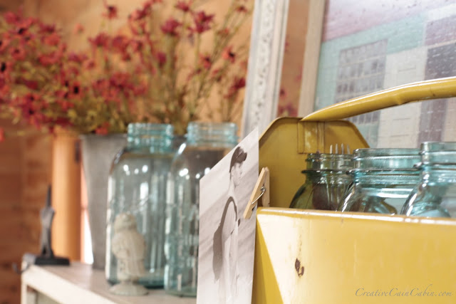 I love the mantel. That yellow tool box has always been my favorite the blue jars are always beautiful!