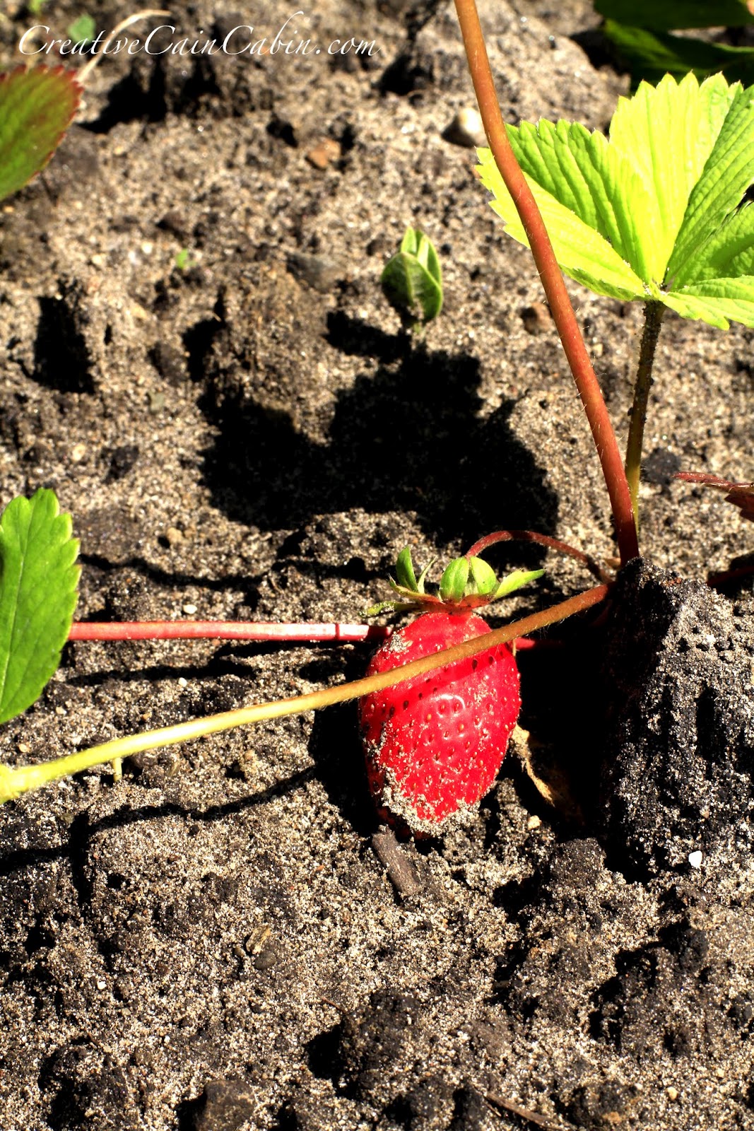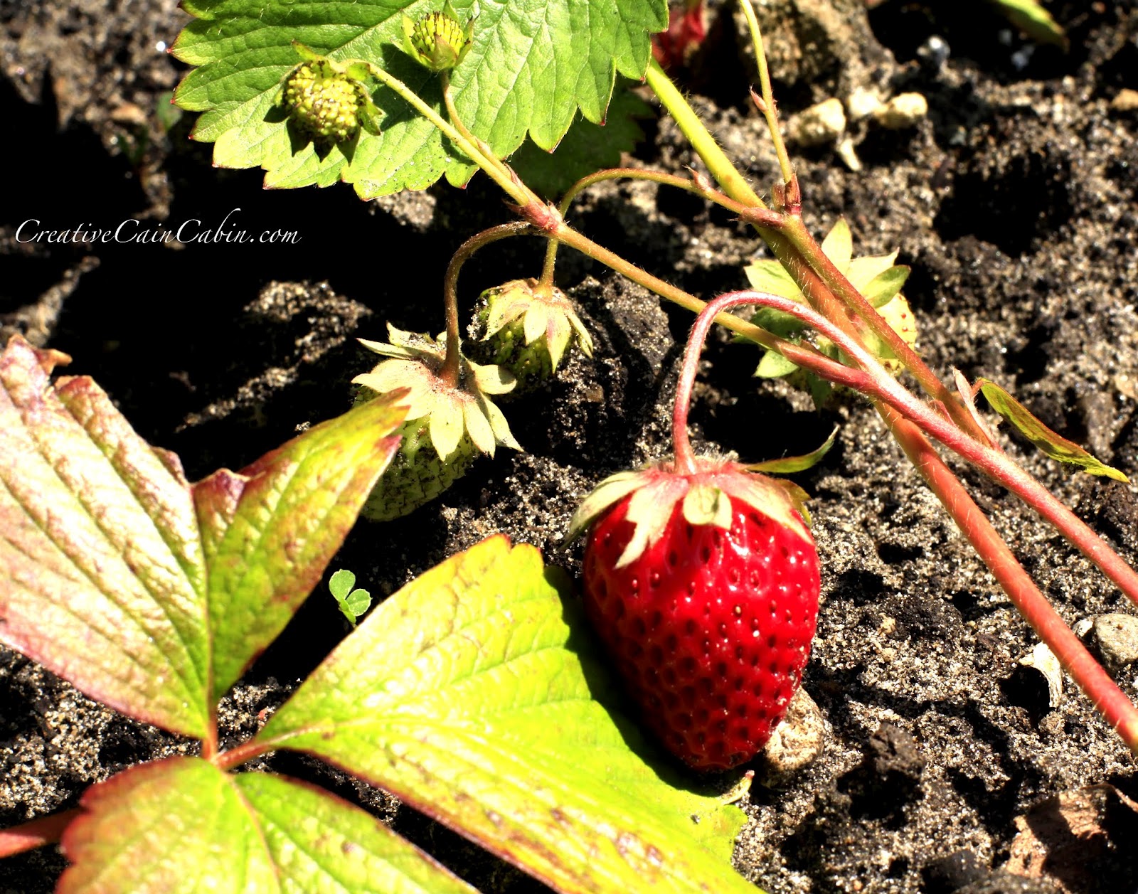 I had to come by to see your ripe strawberries.Isn’t it exciting? We were delighted to find plums on one of our trees today. We have a few strawberry plants in a raised bed. One or two will be ripe each day, but the birds usually get to them before I do.