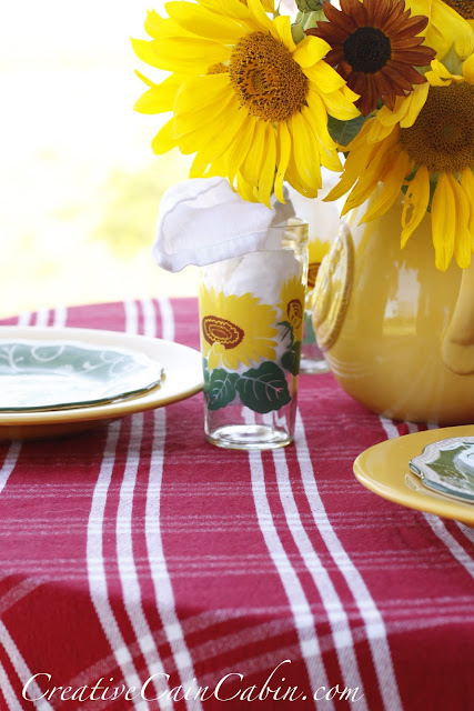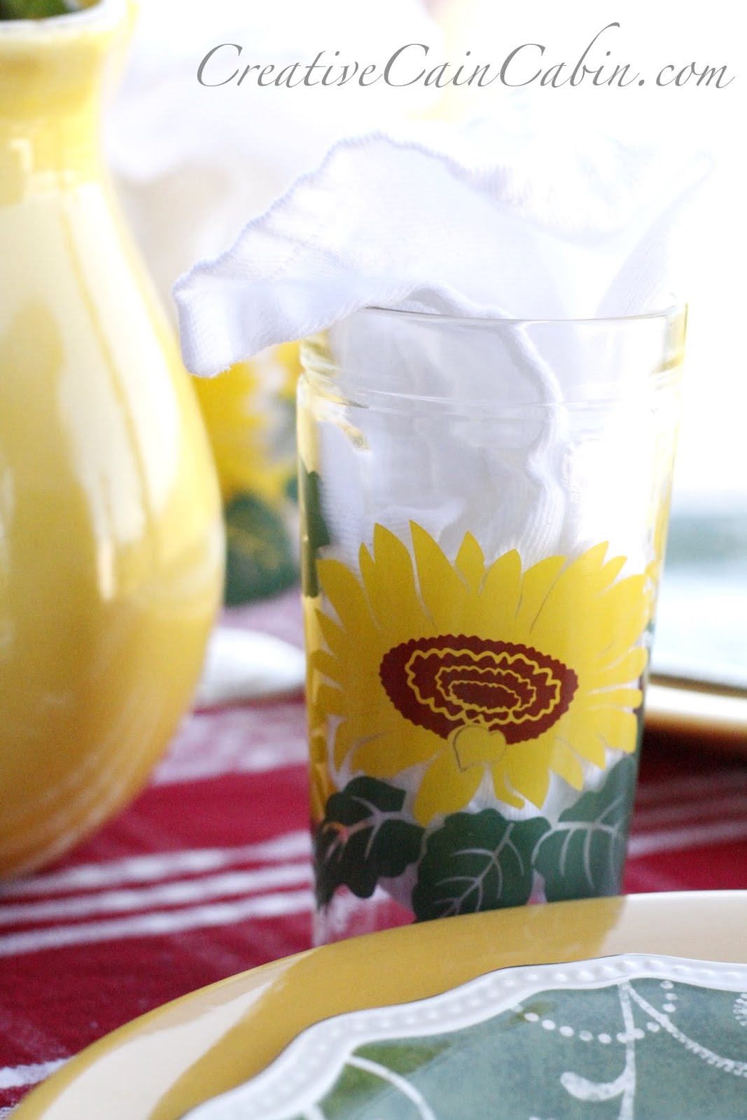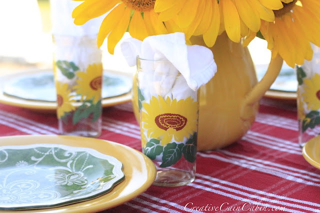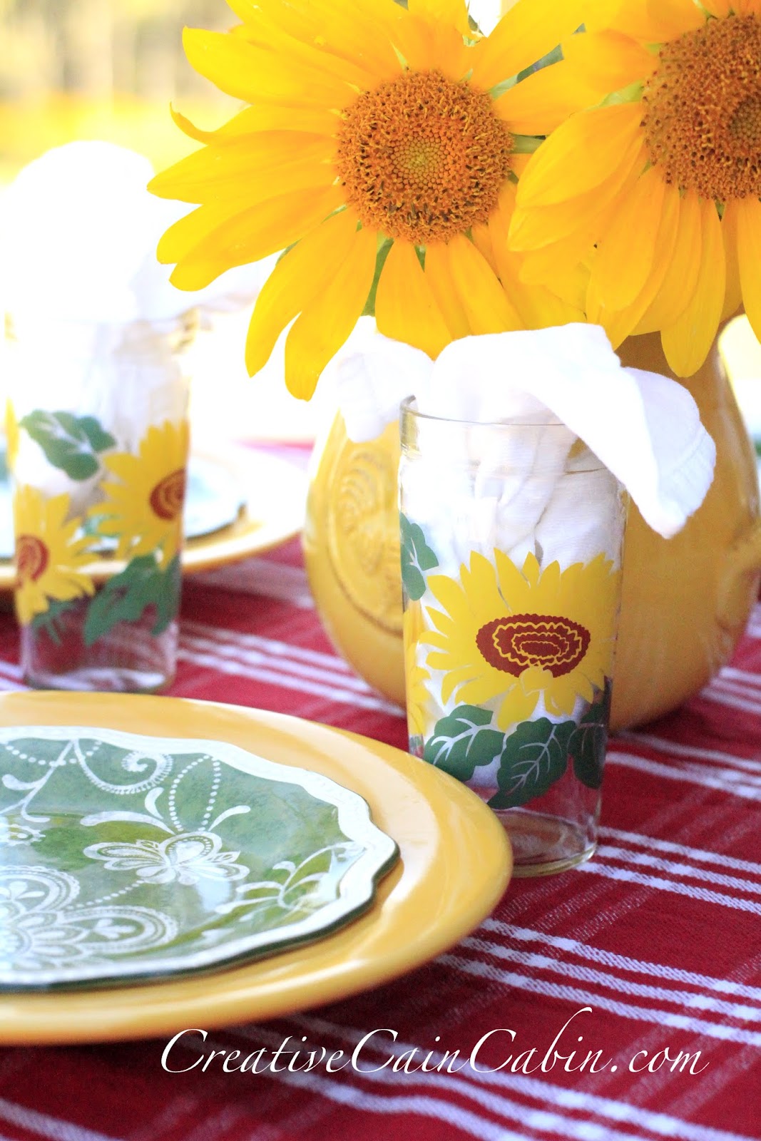 Dawn did I tell you that sunflowers is one of my favorites, I love these sunflower glasses and I really love those big beautiful sunflowers,your tablescapes makes me smile!!!