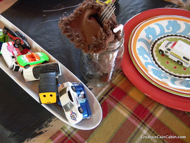 Put a few cars in a serving tray and used mason jars for drinking glasses.