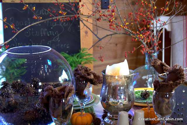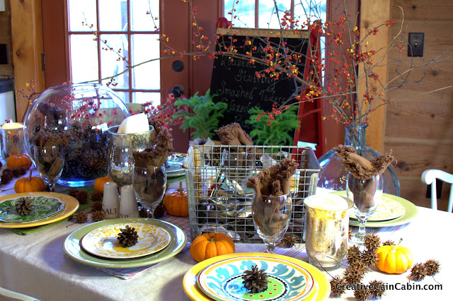 Your Thanksgiving table is lovely, very eclectic. I love it, so perfect for a log house!