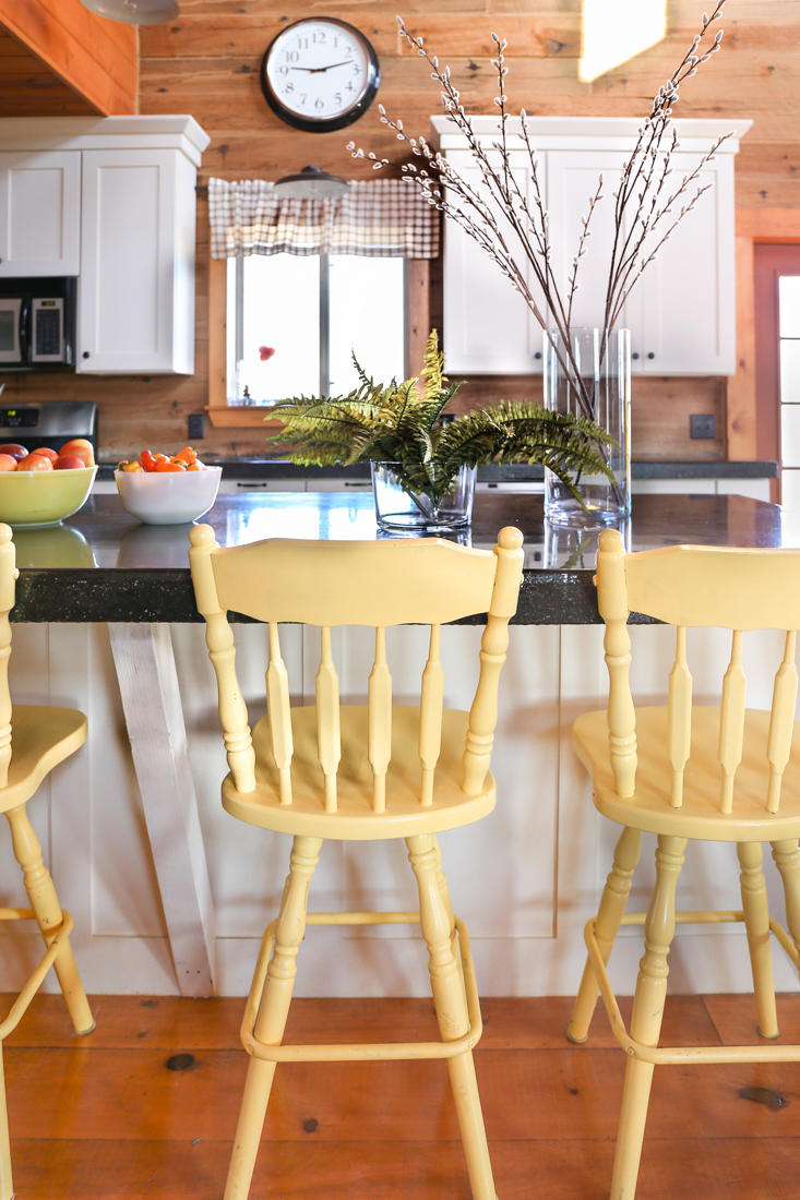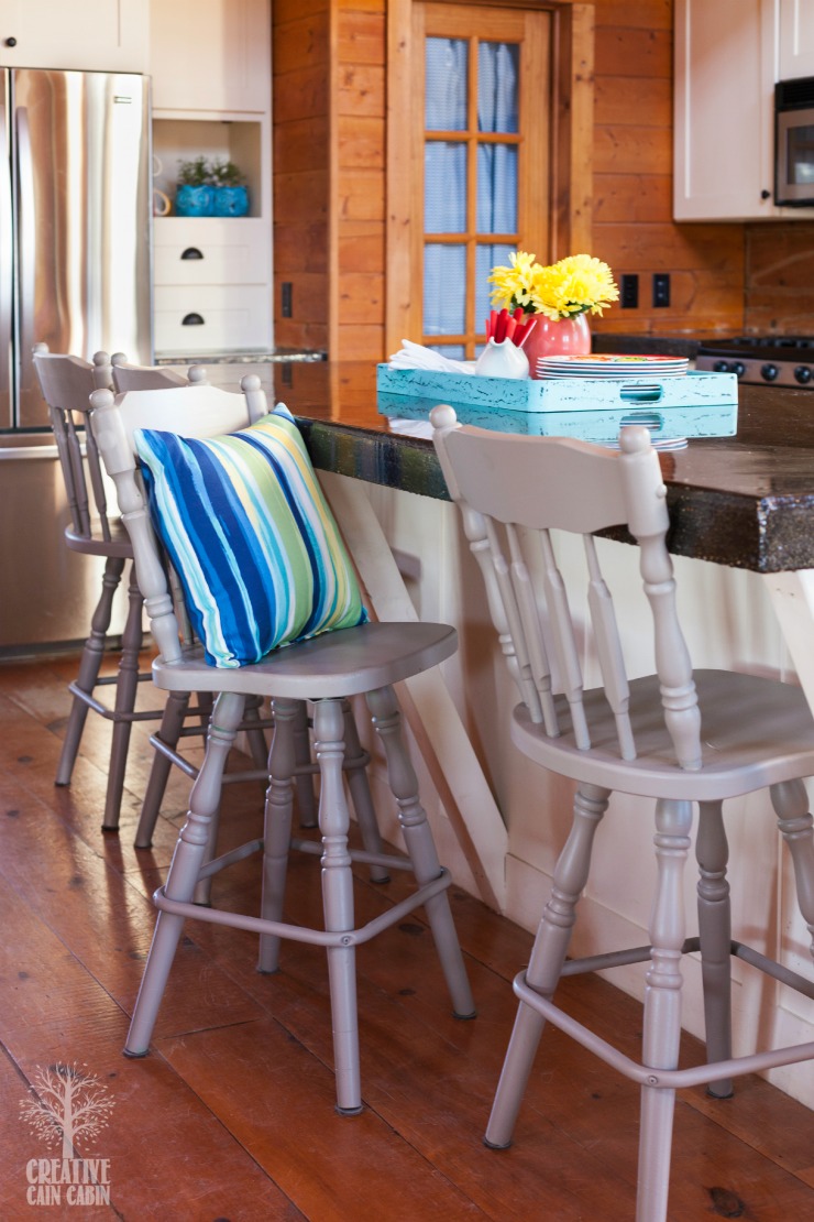 I wanted to show you all the colors the bar stools have been over time so you can see what the stripper was dealing with. The most current color was yellow, I loved the yellow (the stripper thought it was hideous) but as you know I’ve been working on eliminating most bright colors and trying to keep the cabin decorated in more neutral colors. I wasn’t up to doing the stripping project myslef so I hired a professional.