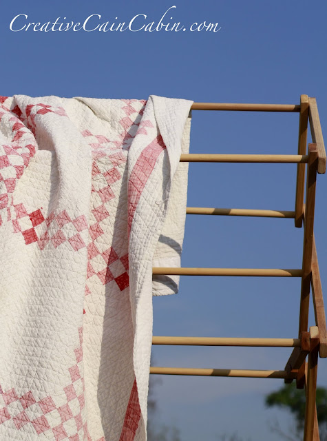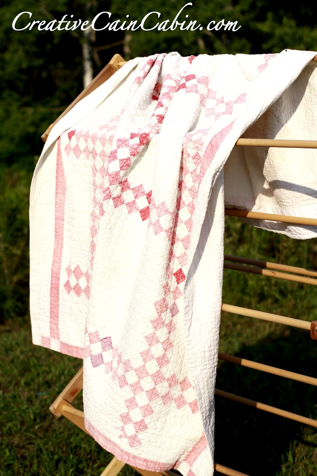 8. Lovely quilt! I’m always a little bit afraid of the chemicals used in dry cleaning, especially on my quilts. You could try washing in an oversized front load washer. That would be easier on the fabric rather than agitation. If it is really fragile, soak it in the tub with a mild soap. Drain and rinse. Just squeeze the water out rather than twisting. The colors are already faded so go ahead and lay it out in the sun.