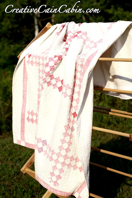 6. Lovely quilt! I’m always a little bit afraid of the chemicals used in dry cleaning, especially on my quilts. You could try washing in an oversized front load washer. That would be easier on the fabric rather than agitation. If it is really fragile, soak it in the tub with a mild soap. Drain and rinse. Just squeeze the water out rather than twisting. The colors are already faded so go ahead and lay it out in the sun.