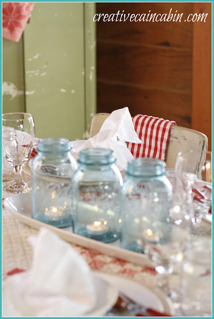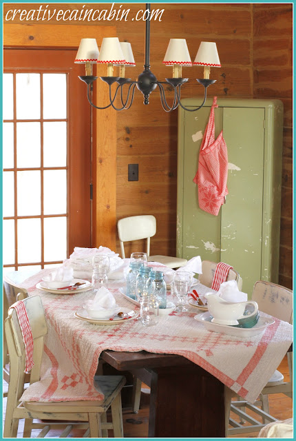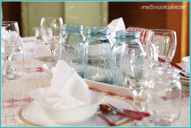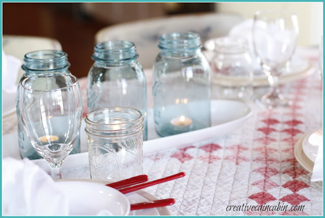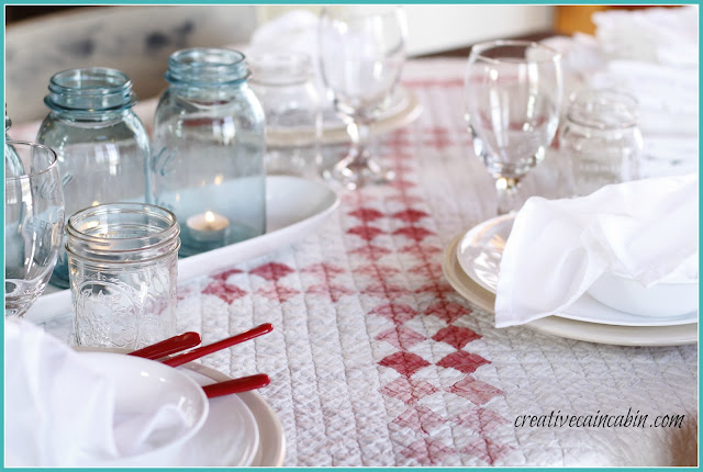 Oh my gosh I love this. I love your use of red and that vintage quilt oh my!!!!! This is the prettiest valentine table scape I have seen. It is perfect decor for your cabin. I love the pop of blue with the mason jars. This is really gorgeous Dawn. Love it.