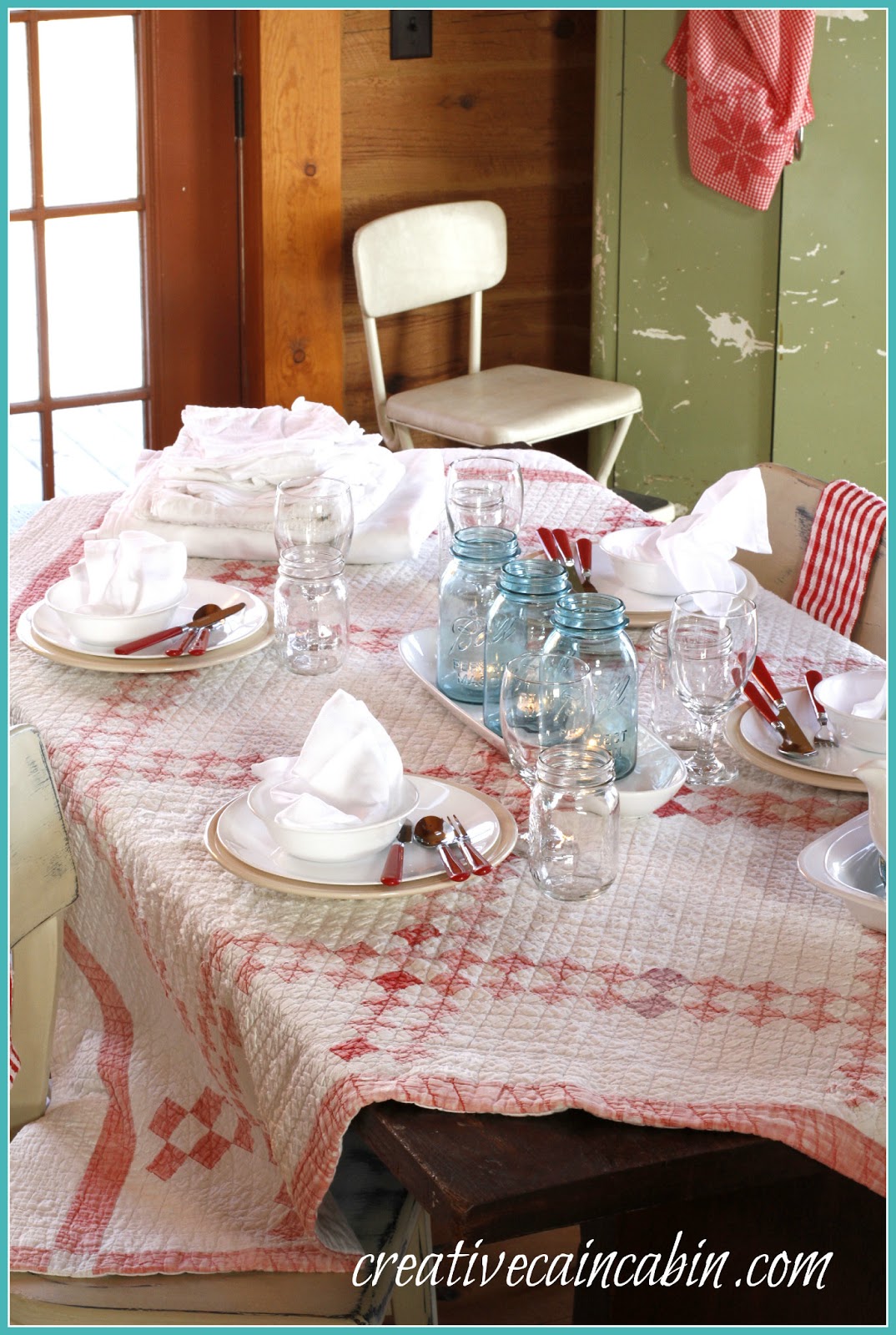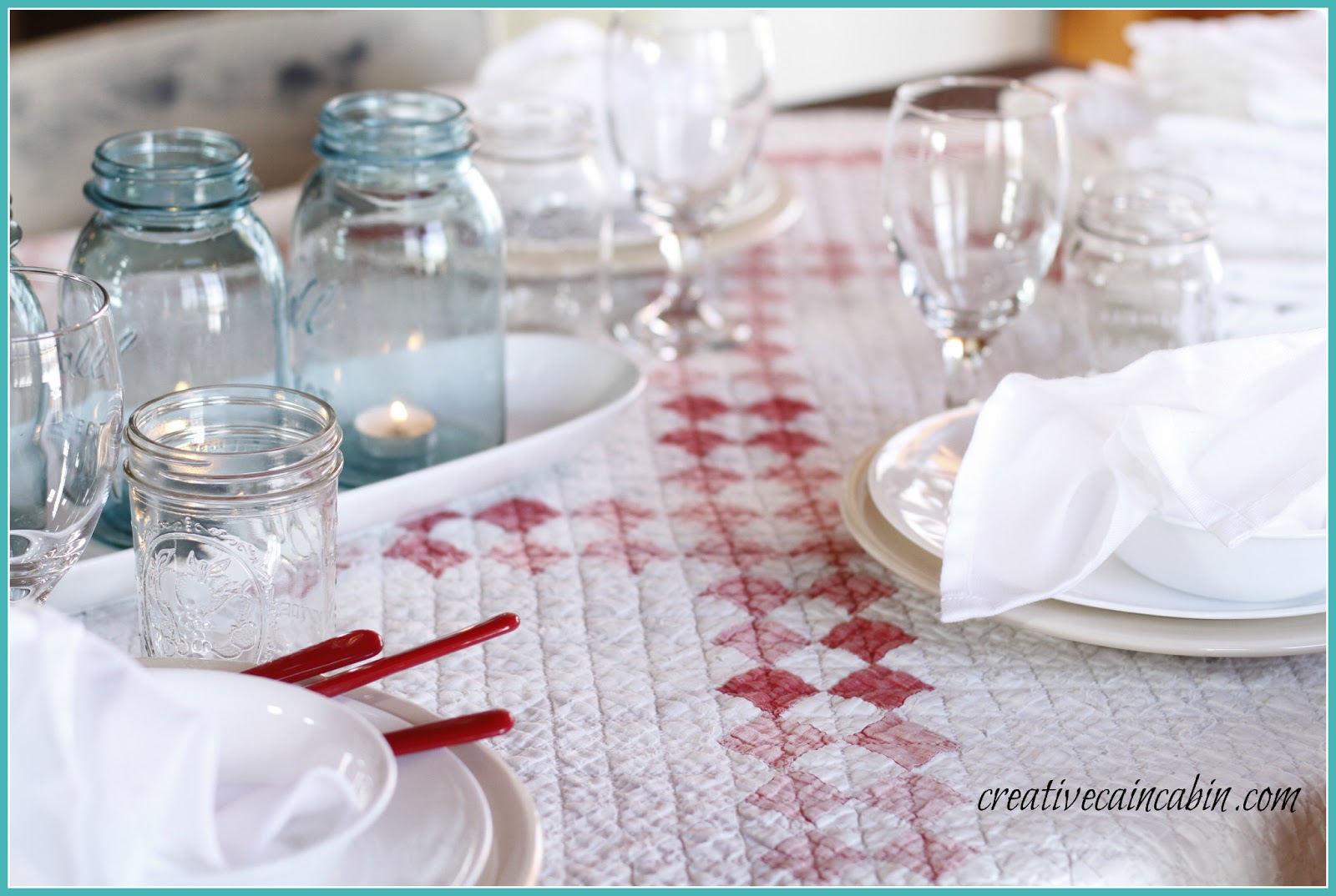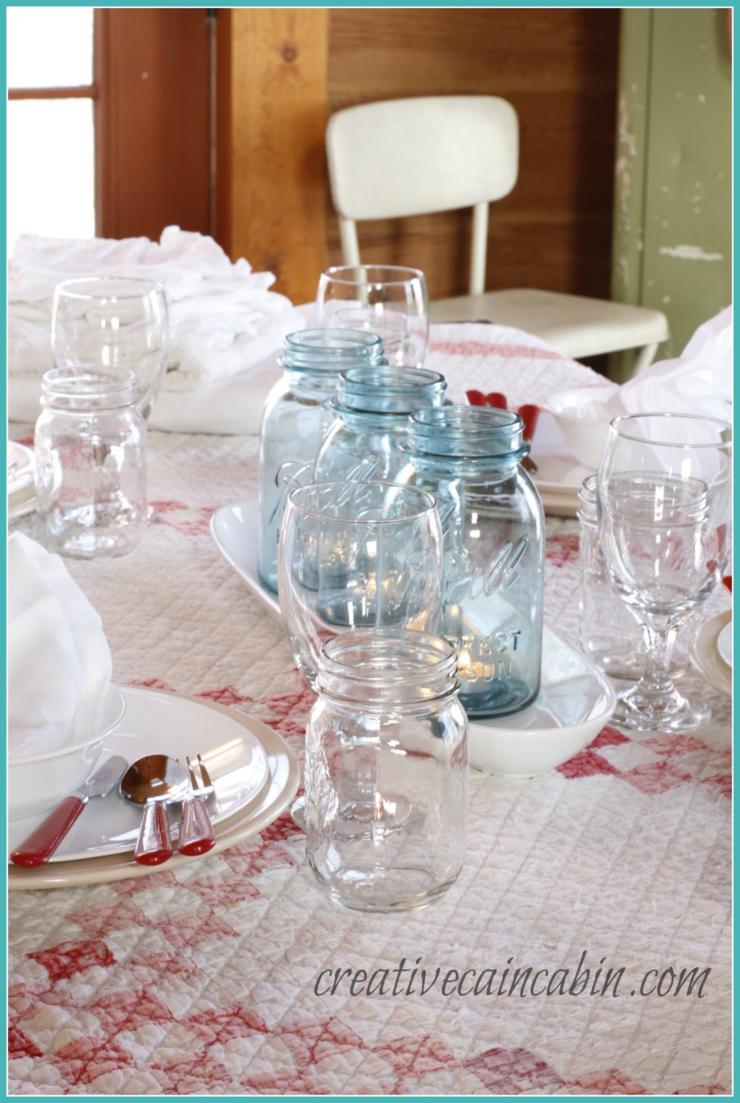 Oh my gosh I love this. I love your use of red and that vintage quilt oh my!!!!! This is the prettiest valentine table scape I have seen. It is perfect decor for your cabin. I love the pop of blue with the mason jars. This is really gorgeous Dawn. Love it.