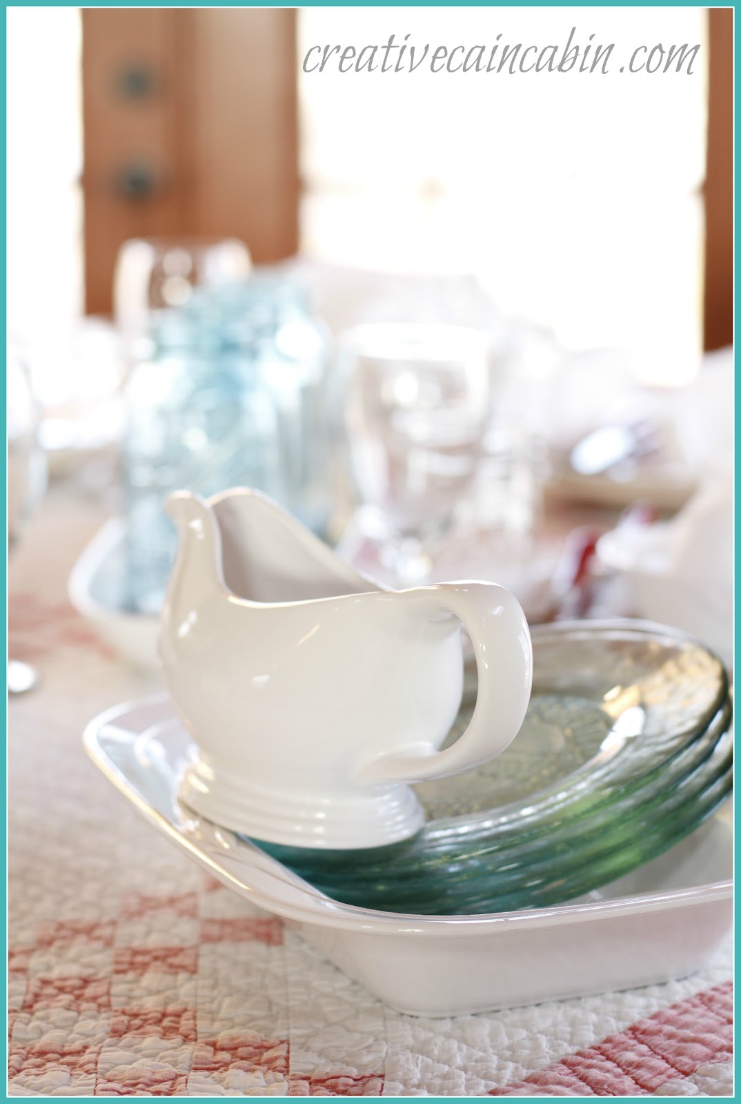 The salad plates are recycled glass and have a blue tint to them, just like the mason jars. And to keep it all together I put it in a white serving dish along with the gravy boat.