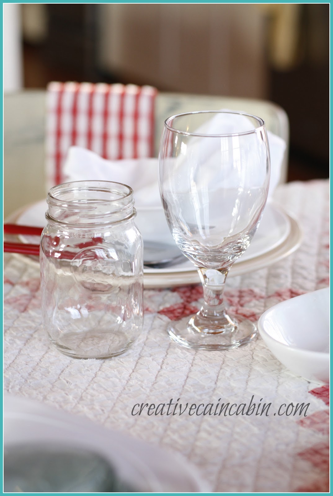 My Valentine’s table consists of a vintage red and white quilt and a combination of mason jars, red flatware, and white dinner plates. Everyone has these simple items in their kitchen and Valentines day doesn’t have to be fancy.