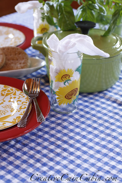 Dawn, you find the best stuff. Love the gingham cloth and those sunflower glasses are perfect with your setting and home. Sweet potato soup? Do share.