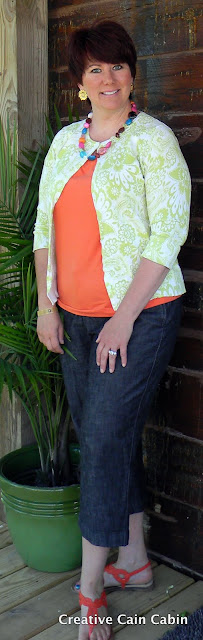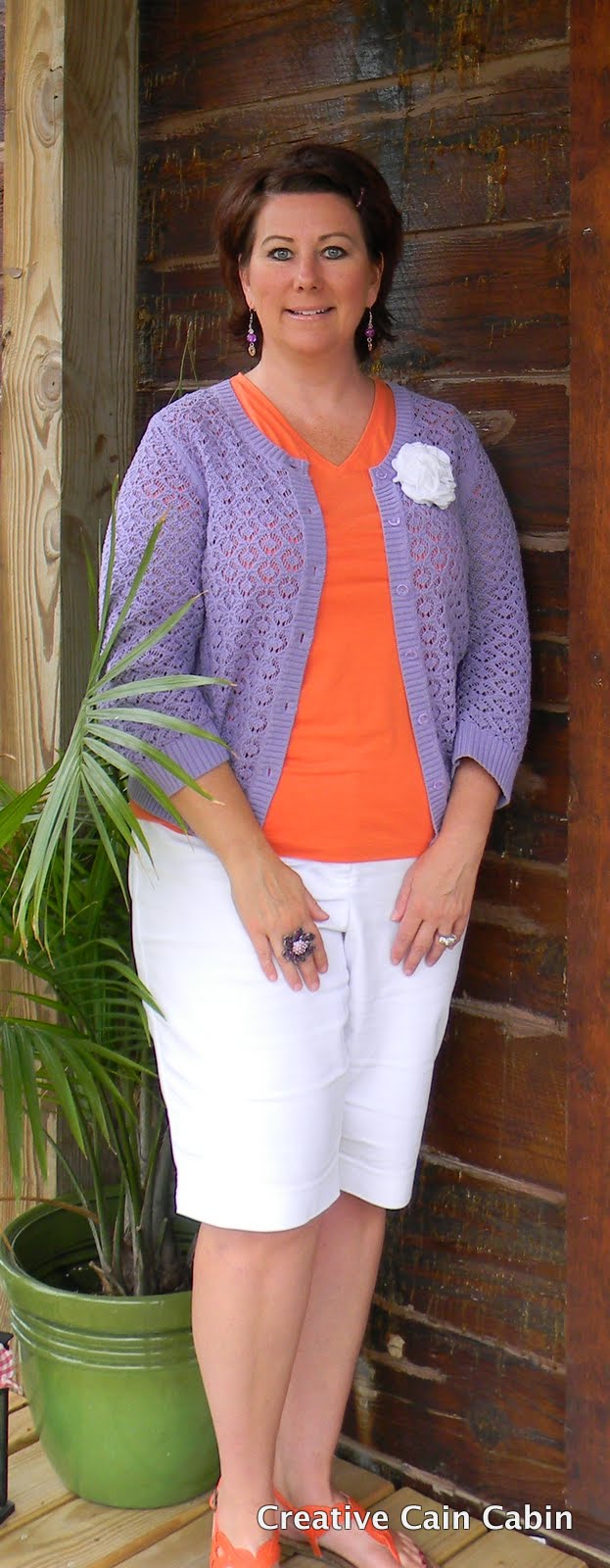 I love those orange earrings. I also like the look with the orange top and purple shrug. I never have put those two colors together. Finally, I think you look great in the last outfit with the green.
