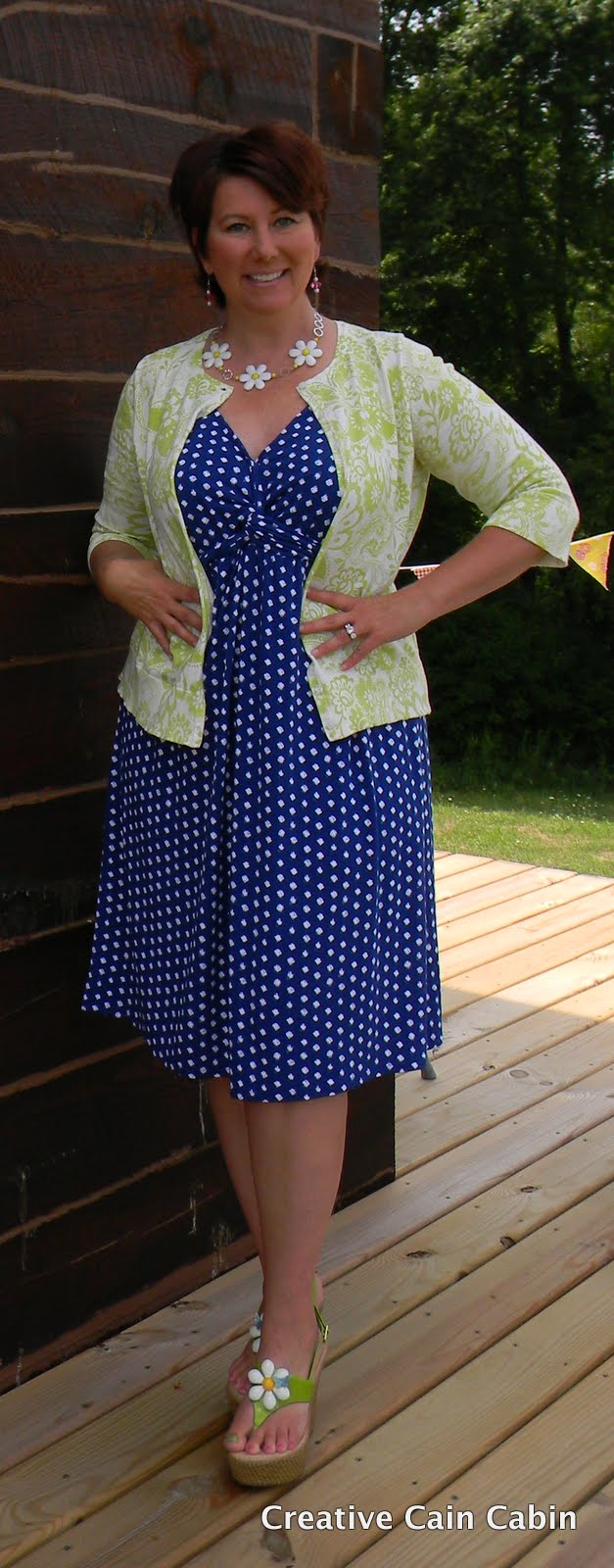 Fun, fun week! I love the blue dress, green cardi, and sassy shoes. I keep seeing those at Target and wonder how they look ON. Success. That necklace looks vintage! Great combo.